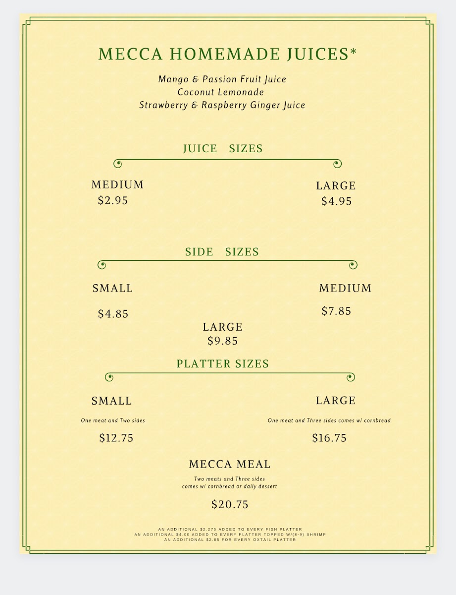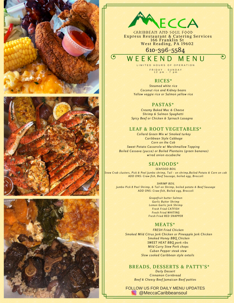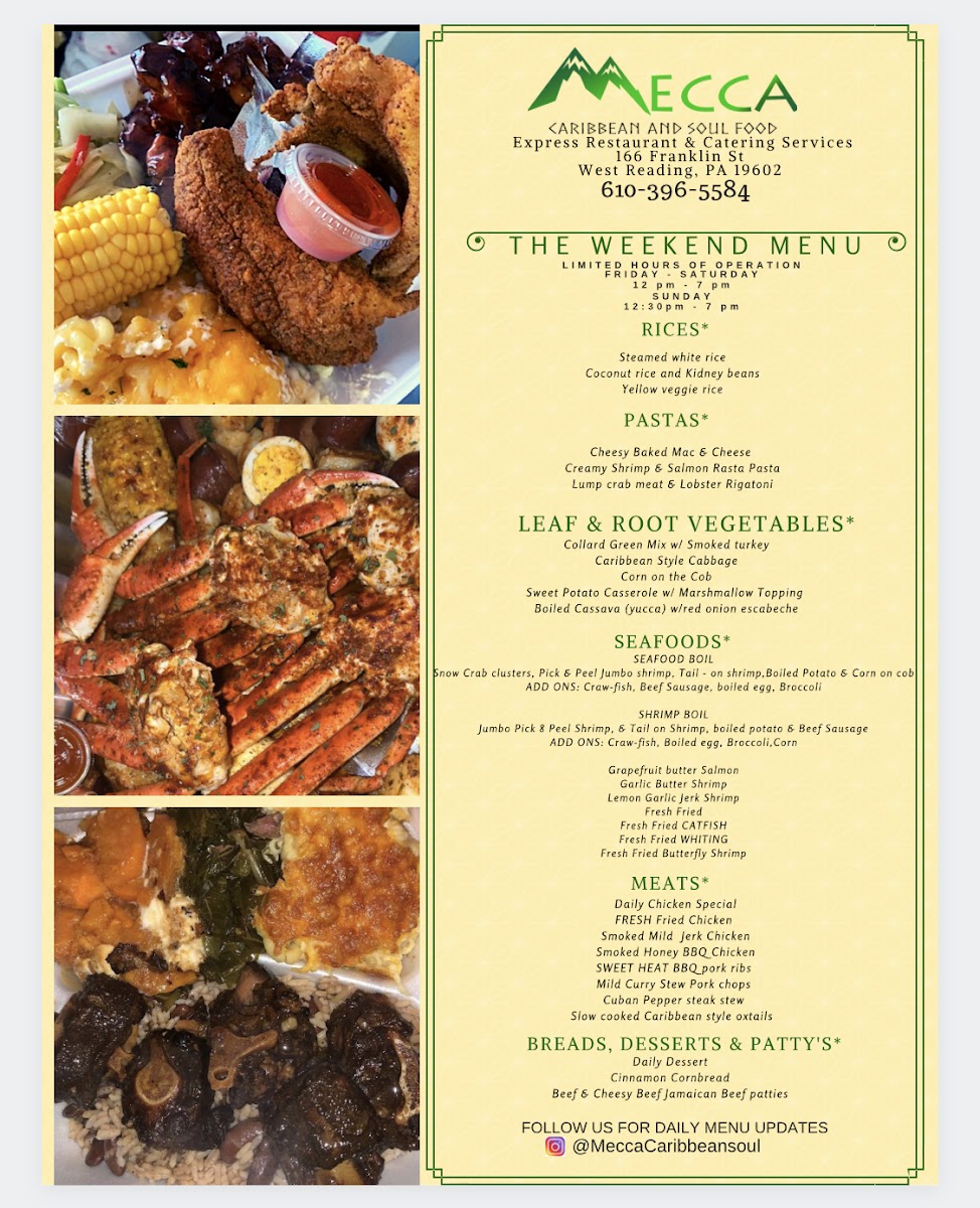 Welcome to Mecca Caribbean and Soul Food, a culinary treasure nestled at 166 Franklin St, West Reading, PA. With the heartwarming ambiance of a family gathering and a menu bursting with flavors, this charming eatery presents an authentic taste of Caribbean and soul food. The moment you step through the door, you're greeted not only by the enticing aromas but also by the warm spirits of the staff, who cultivate an atmosphere that feels like home.