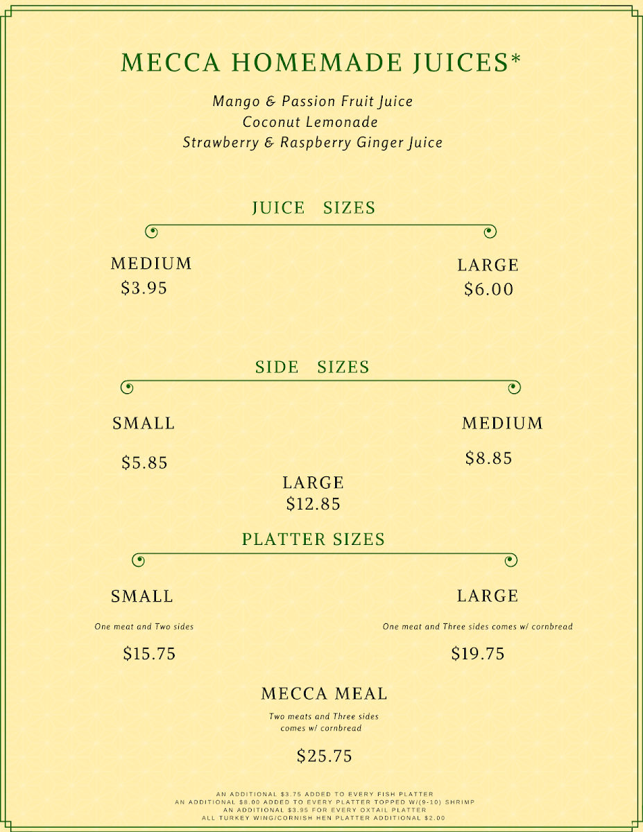 Mecca's charm lies in its generous portions; customers rave about the platters that could easily weigh 10 lbs. Each dish is meticulously crafted, ensuring every bite is a delight. Whether it’s the crispy fried chicken paired with rich mac and cheese or savory greens, the food offers a satisfying journey through soul food traditions. The pricing is refreshingly reasonable, with entrees starting around $15, featuring not just the main dish, but two sides that enhance the experience.